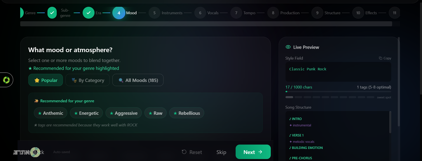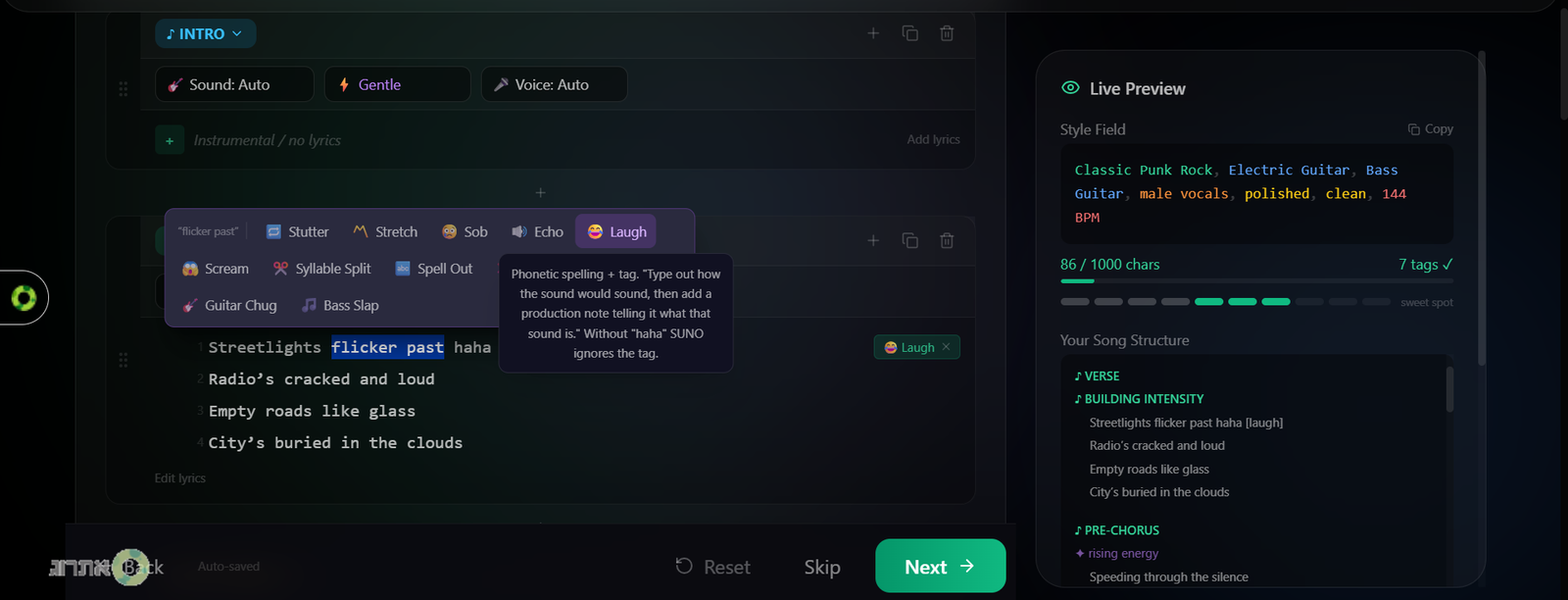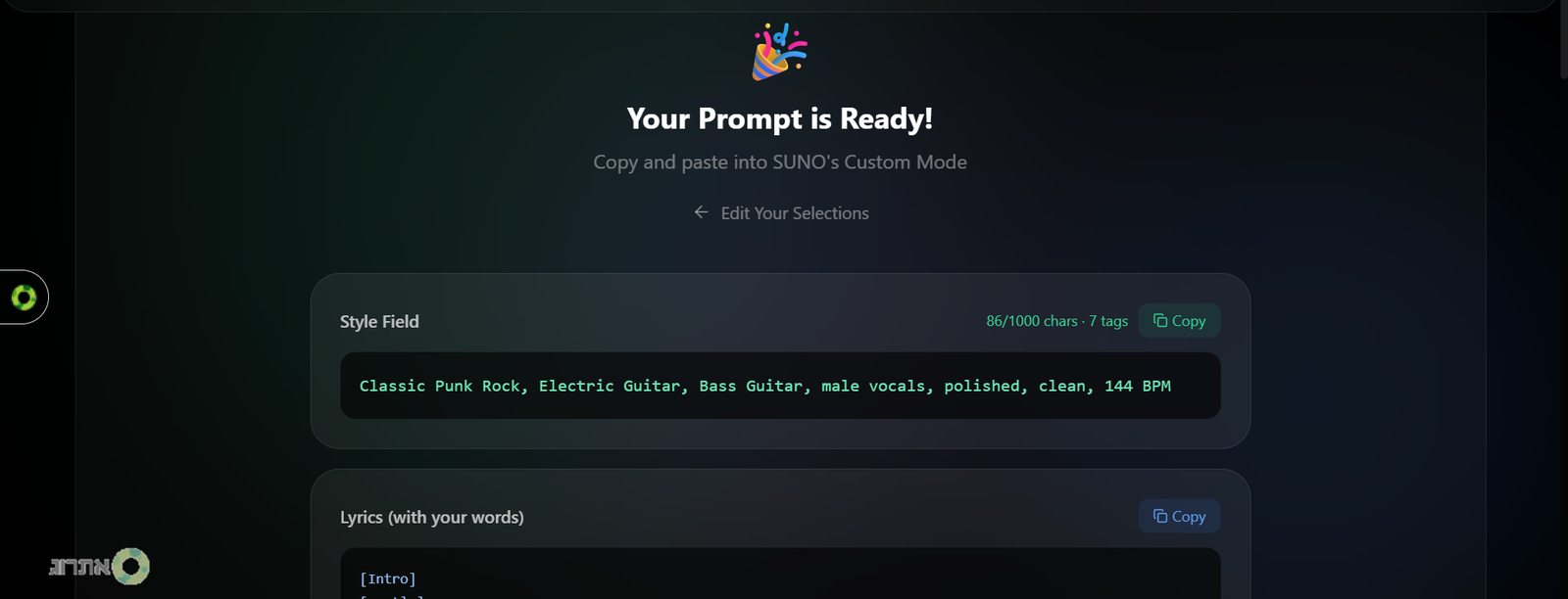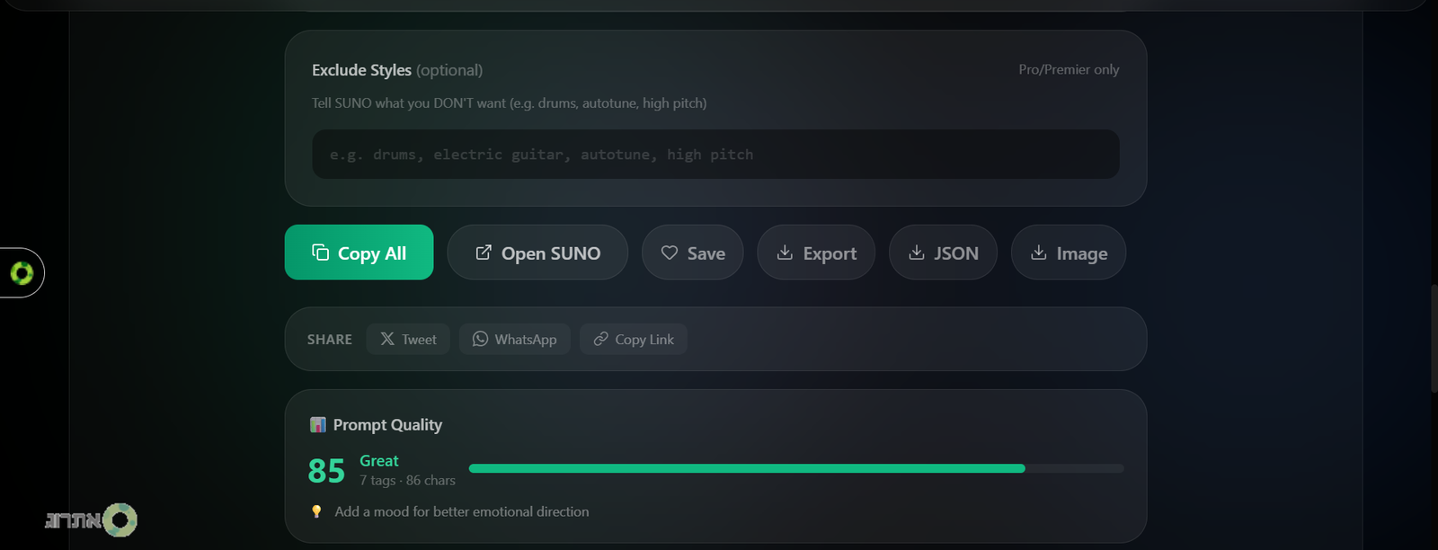 - Enforces the 5-8 tag discipline that community reports consistently outperforms 15-tag stuffing, across SUNO versions (V4.5+ supports up to 1,000-char Style field, but precision beats volume per community findings)